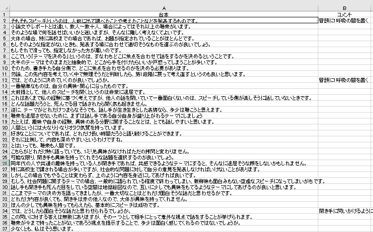 台本というのは、基本的に1文ごとに分けられている。小論文みたく文章を書き連ねても良いのだが、複数人で発表する際や、間の取り方や話し方に工夫を凝らしたいことが多いスピーチでは、脚本のように分けて書いてしまうのが良いだろう。